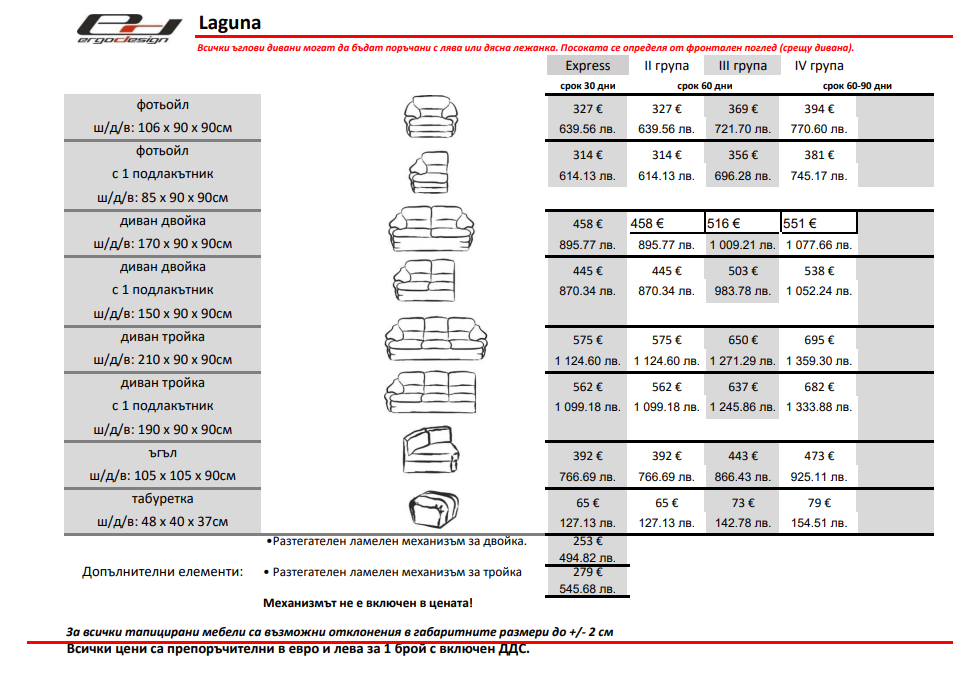 От тук може да изберете Вашата дамаска: Втори ценови клас → Трети ценови клас → Четвърти ценови клас → Пети ценови клас → Трети и четвърти ценови клас Еко кожи →   Всеки луксозен диван Laguna ErgoDesign може да бъде закупен на изплащане: • Без първоначална вноска • Без допълнителни такси • Без оскъпяване • 0% лихва за целия период • 0% ГПР • 10 равни вноски за 10 месеца