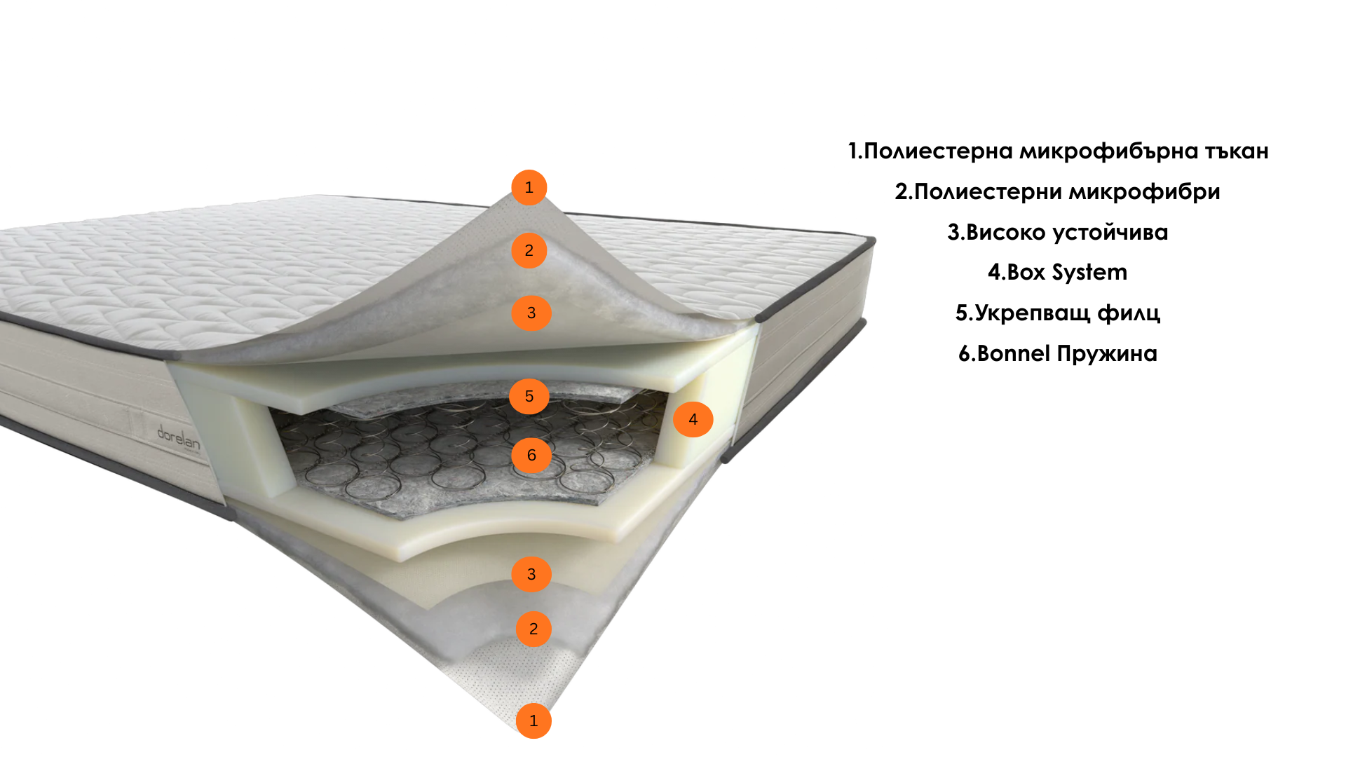 Стабилен и издръжлив, проектиран да издържи дълго време без да губи качество и функционалност. Взаимосвързаните Bonnel пружини заедно с високоустойчивата тъкан и подсилващия филц, гарантират уникалността на почивката от Dorelan всяка вечер.