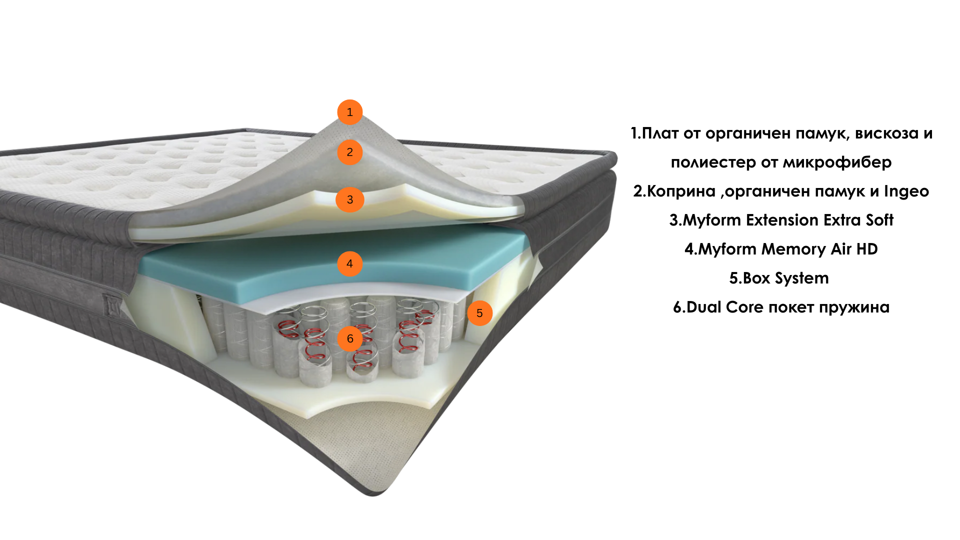 Dual Technology: Технология, съчетаваща специално пружиниране на независима двойна система HS предназначени за тази употреба с Myform Memory Air HD, осигуряващи перфектна мускулно подравняване на скелета за всички типове тяло и перфектно психо-физическо възстановяване.