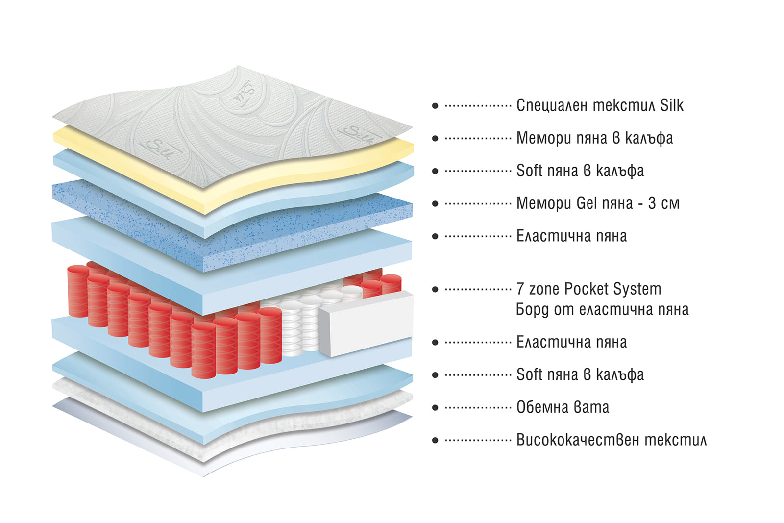 Състав на матрака: прошивка - специален текстил Silk, Memory пяна/обемна вата, soft пяна; ядро - пружинен пакет 7 zone Pocket System, Memory Gel пяна, еластична пяна.