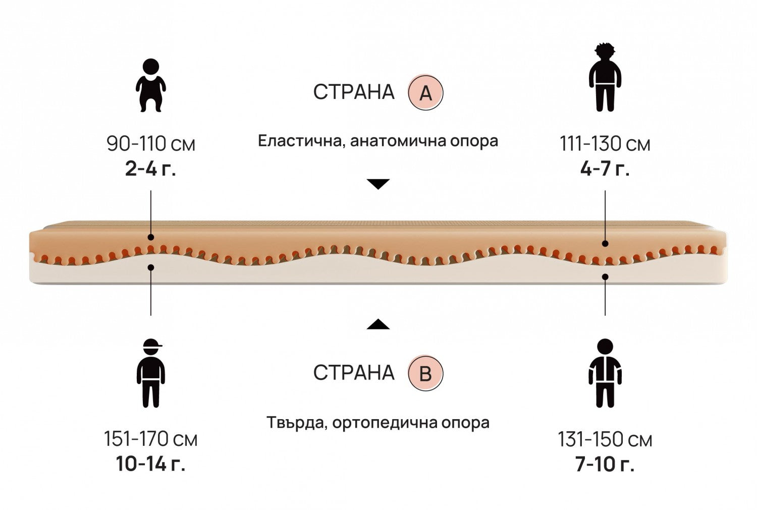 Стабилна, ортопедична, но не прекалено твърда опора- идеална за периода на активен растеж. Осигурява необходимата почивка и комфорт за децата до училищна възраст.