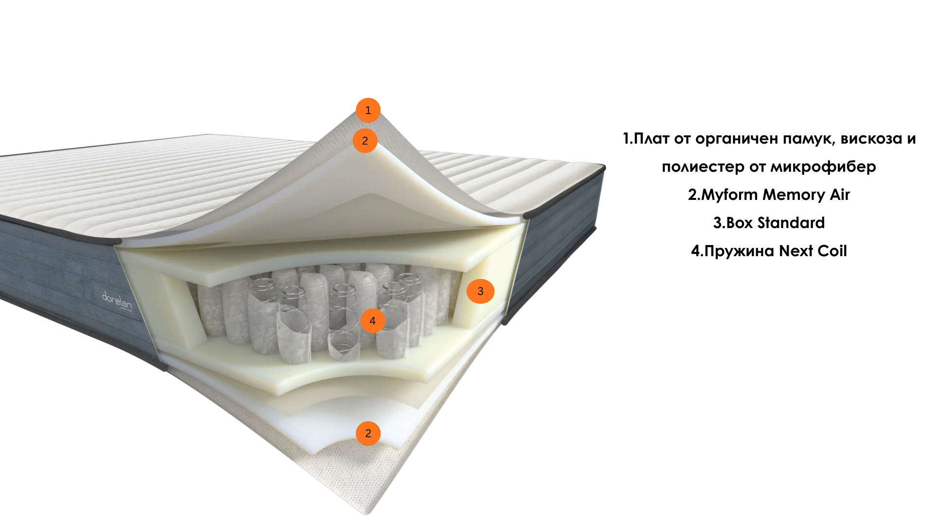 Стабилен и издръжлив, проектиран да издържи дълго време без да губи качество и функционалност. Взаимосвързаните пружини (Spring NextCoil) заедно с високоустойчивата тъкан и подсилващия филц, гарантират уникалността на почивката от Dorelan всяка вечер.