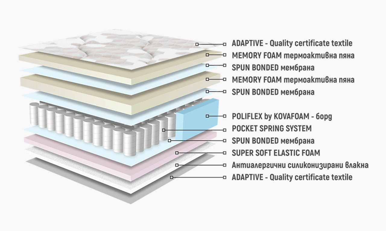Ядро: покет пружини, високоеластична пяна, мемори пяна