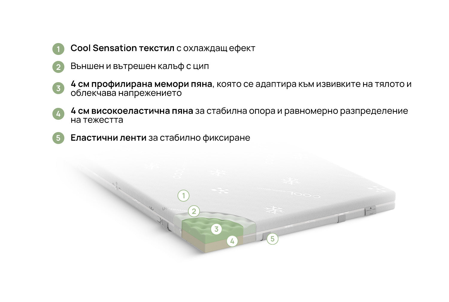 CoolComfort topper е топ матрак, който комбинира нежната адаптивност на профилирана мемори пяна и стабилната опора на високоеластична пяна. Той моментално подобрява комфорта на стария или матрак и ги превръща в удобно място за сън – вкъщи, на вилата или на път.